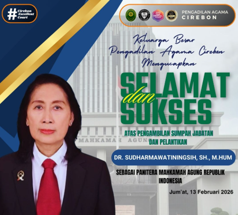 Keluarga Besar Pengadilan Agama Cirebon mengucapkan Selamat dan Sukses atas pengambilan sumpah jabatan dan pelantikan Dr. Sudharmawatiningsih, S.H., M.Hum sebagai Panitera Mahkamah Agung Republik Indonesia