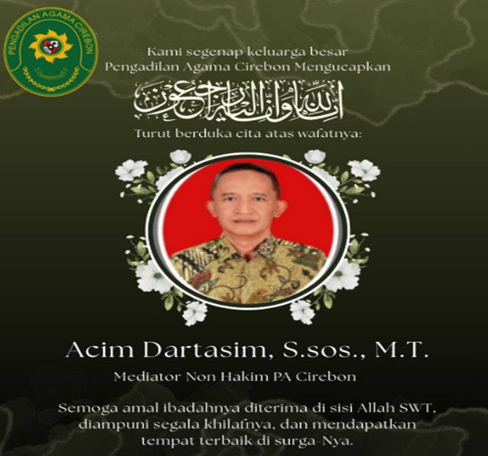 Segenap keluarga besar Pengadilan Agama Cirebon turut berduka cita yang sedalam-dalamnya atas wafatnya Acim Dartasim, S.Sos., M.T., (Mediator Non Hakim PA Cirebon)